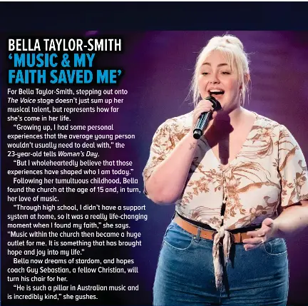 With the first round of blind auditions kicking off on last nights season premiere of The Voice Australia was taken with the vocal stylings of Bella Taylor Smith a 23-year-old singing teacher from Sydney.